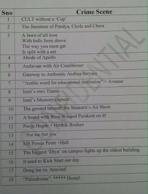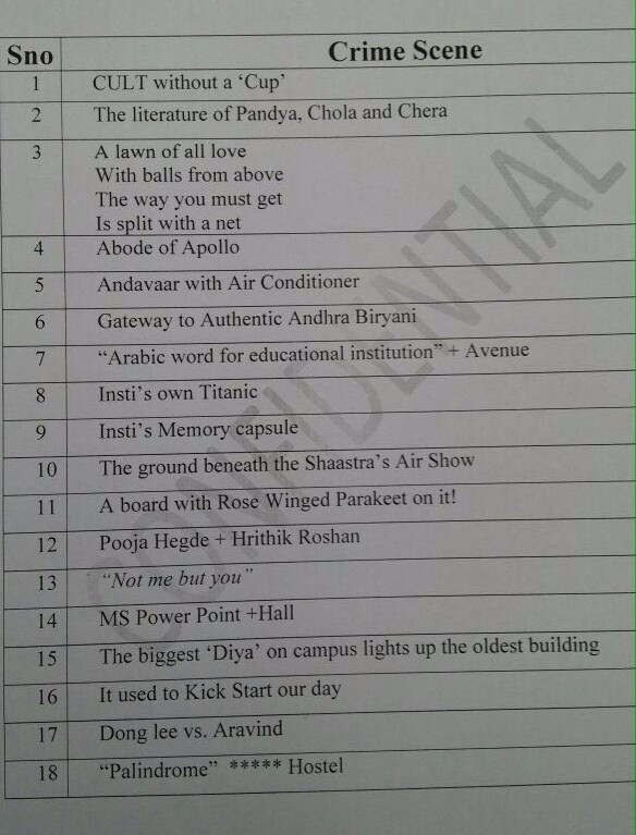 The clues were interesting. For example, the first clue was 'CULT without a cup.' In insti, cup stands for U grade (fail). This led to CLT or the Central Lecture Theater.